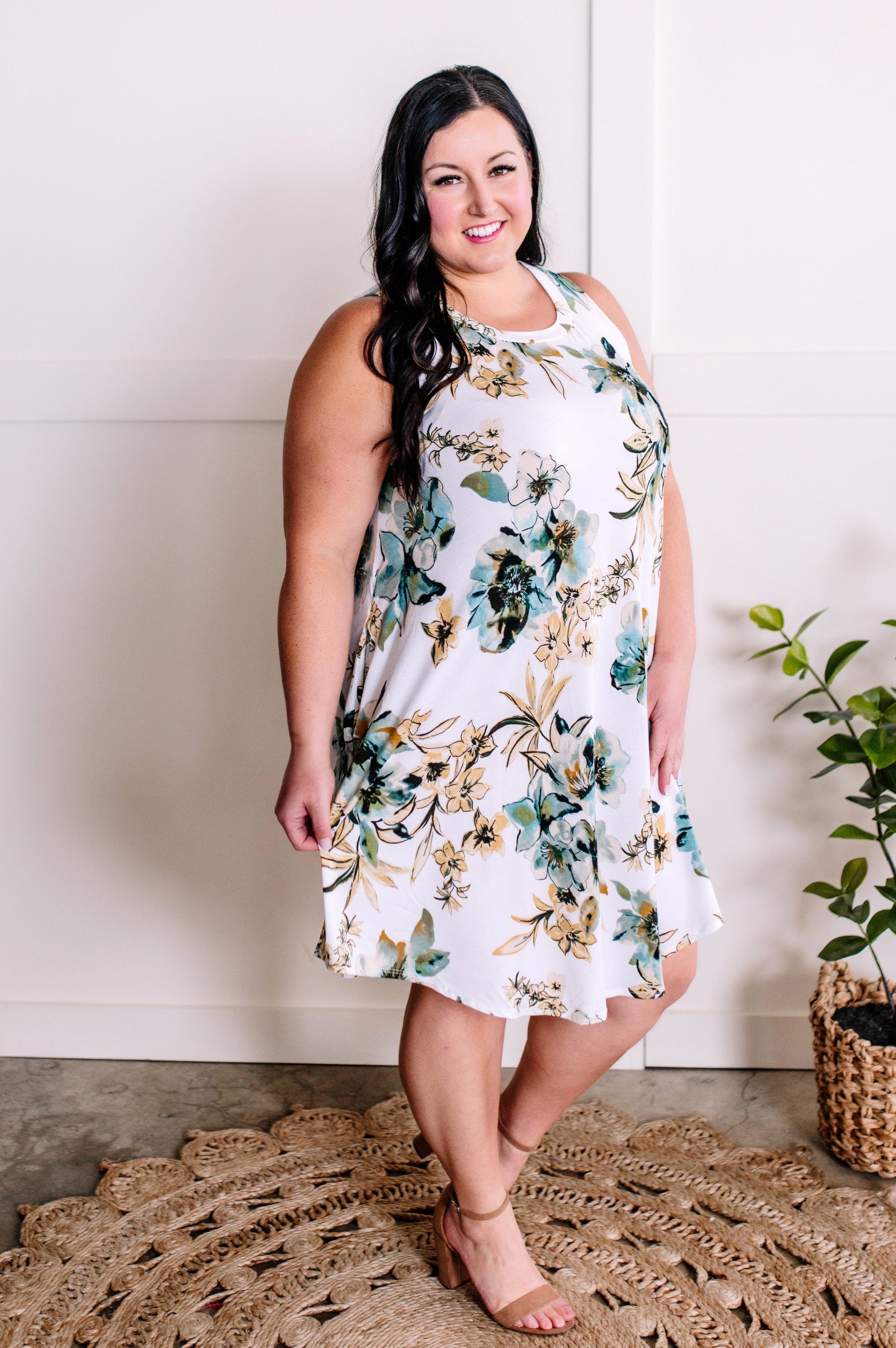 Sleeveless Shift Dress With Pockets In Teal, Yellow & Ivory Florals