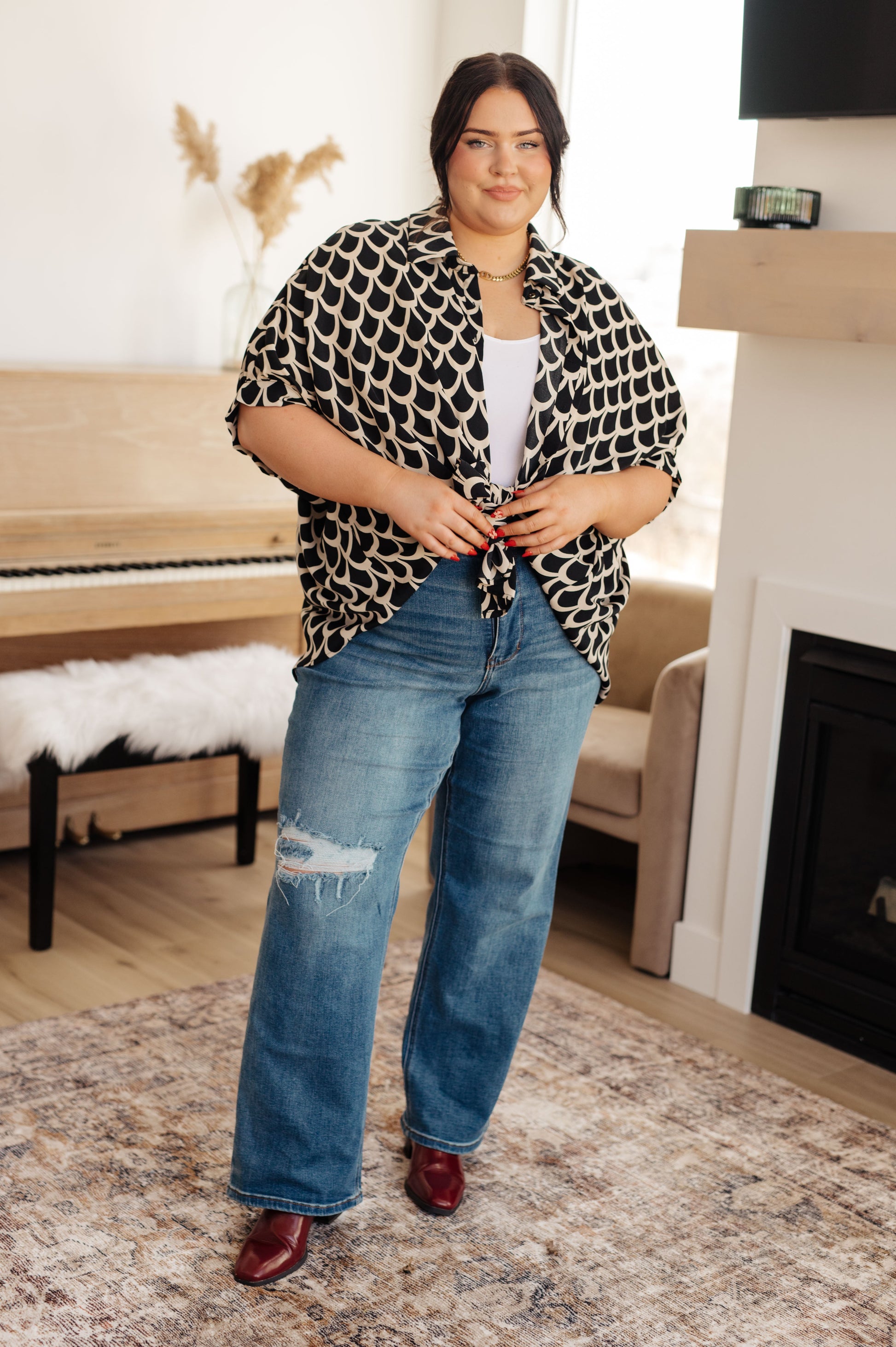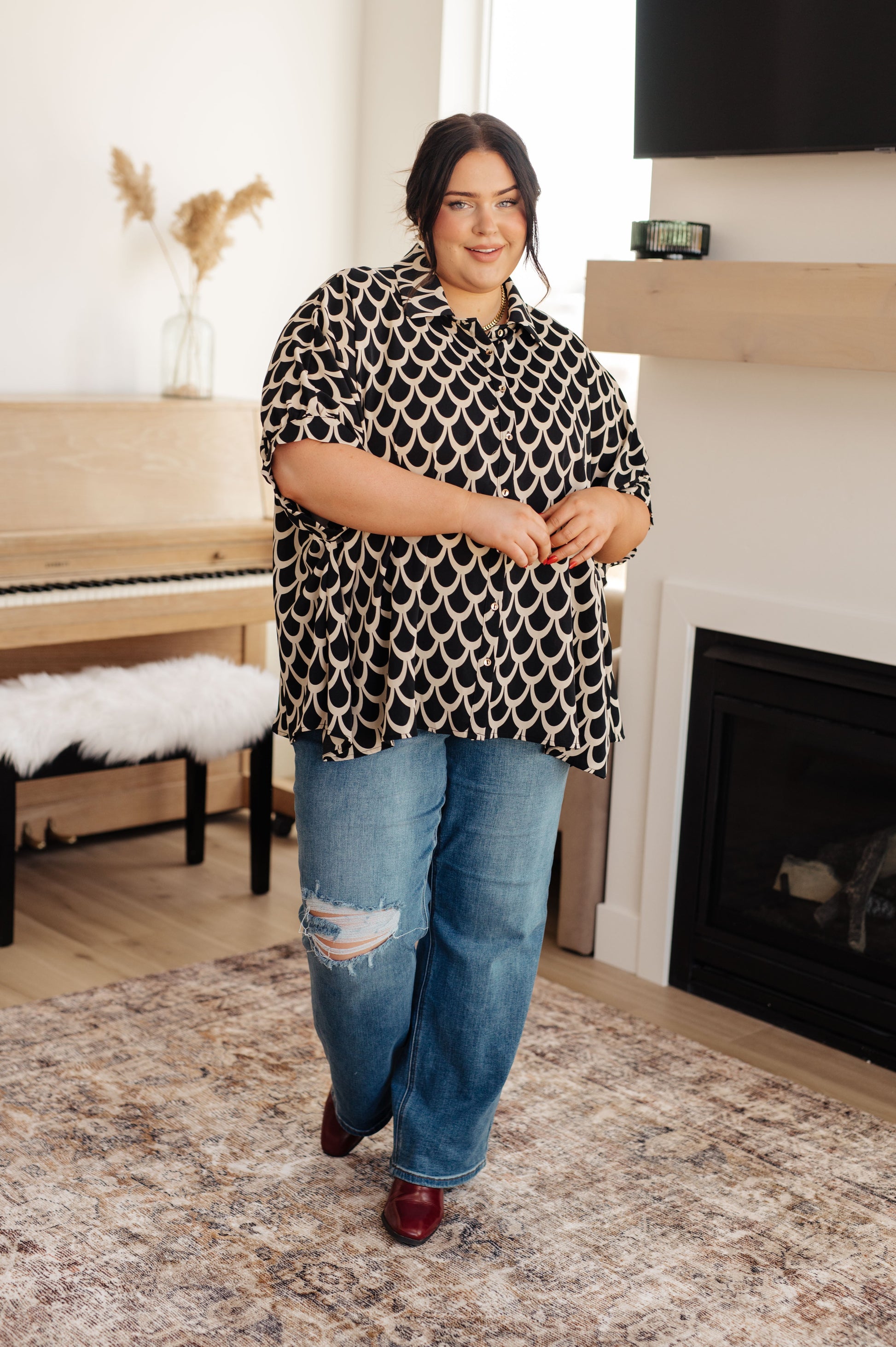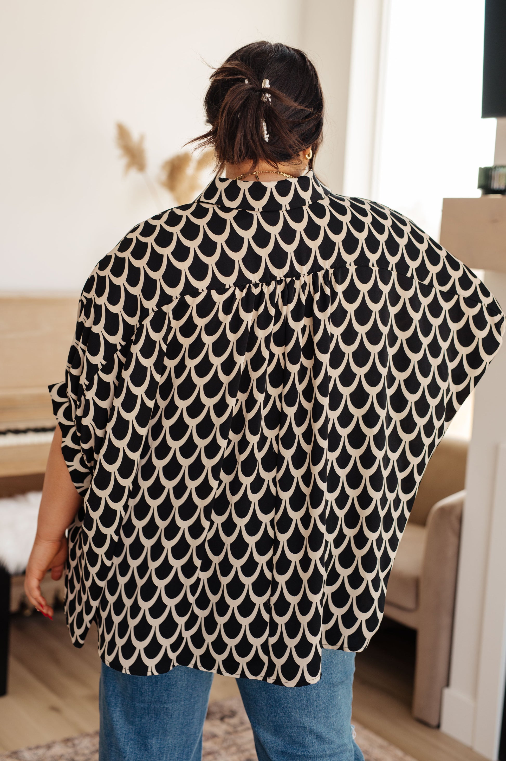 Take your look back to the roaring twenties with this Art Deco Button Up Blouse! Its lightweight woven fabric, dolman sleeves, and banded sleeve cuffs offer an ultra-comfortable fit and timeless style. With its eye-catching art deco print and oversized boxy fit, your look is sure to stand out!