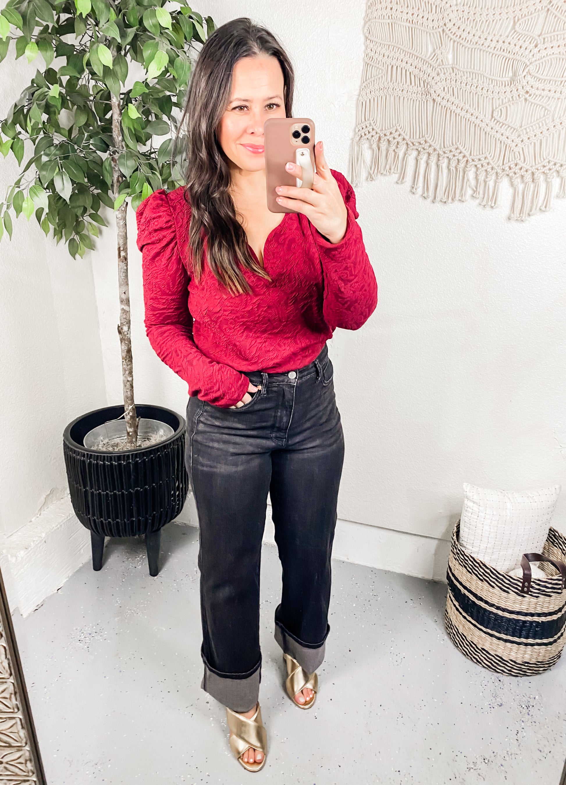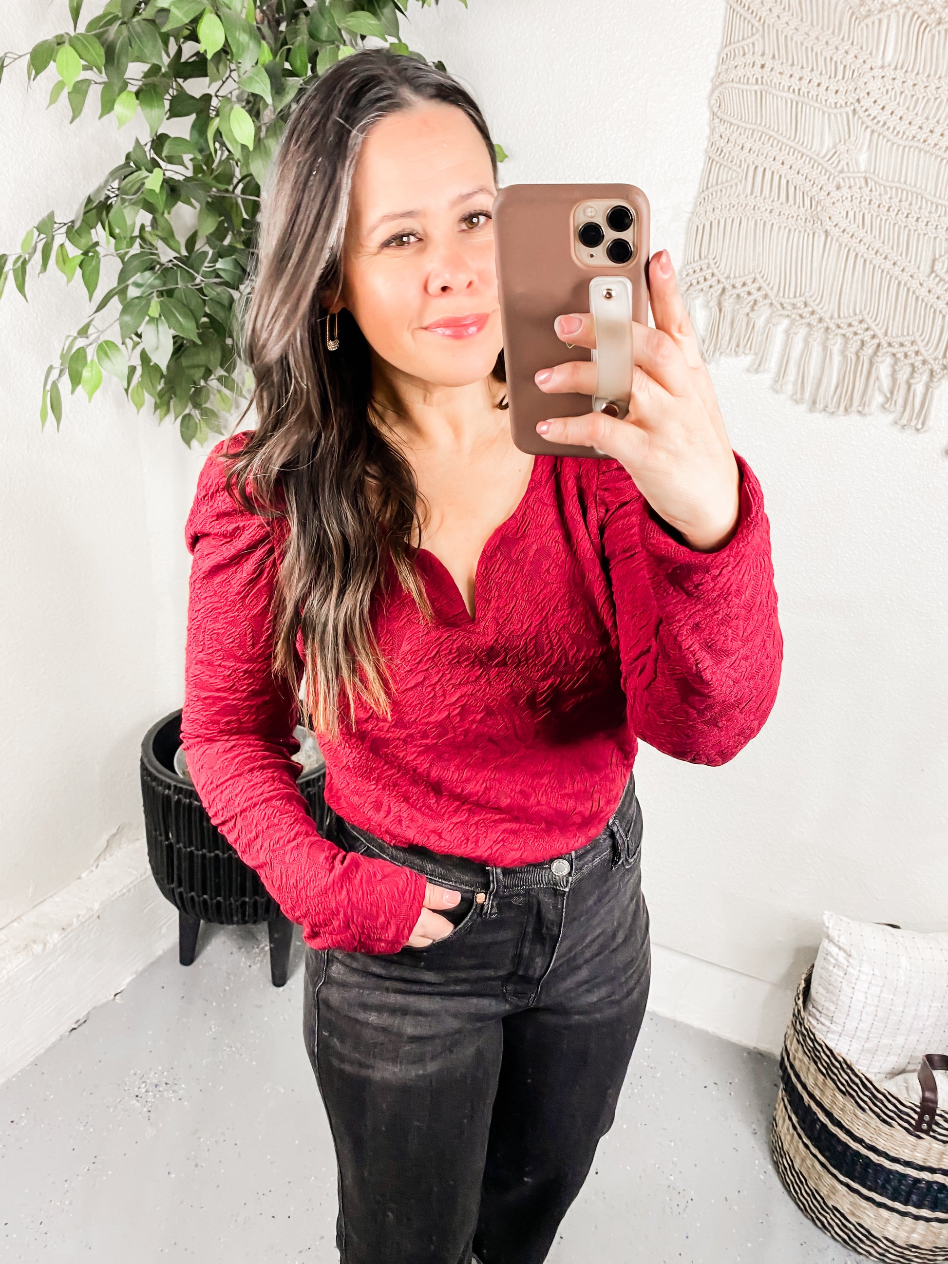 This Ask A Question Ruched Sleeve Top will be the perfect wardrobe staple for any occasion. A jacquard knit gives a luxurious look. The sweetheart neckline and puff sleeve add a flattering, feminine touch. Look stunning in this rich color top.
