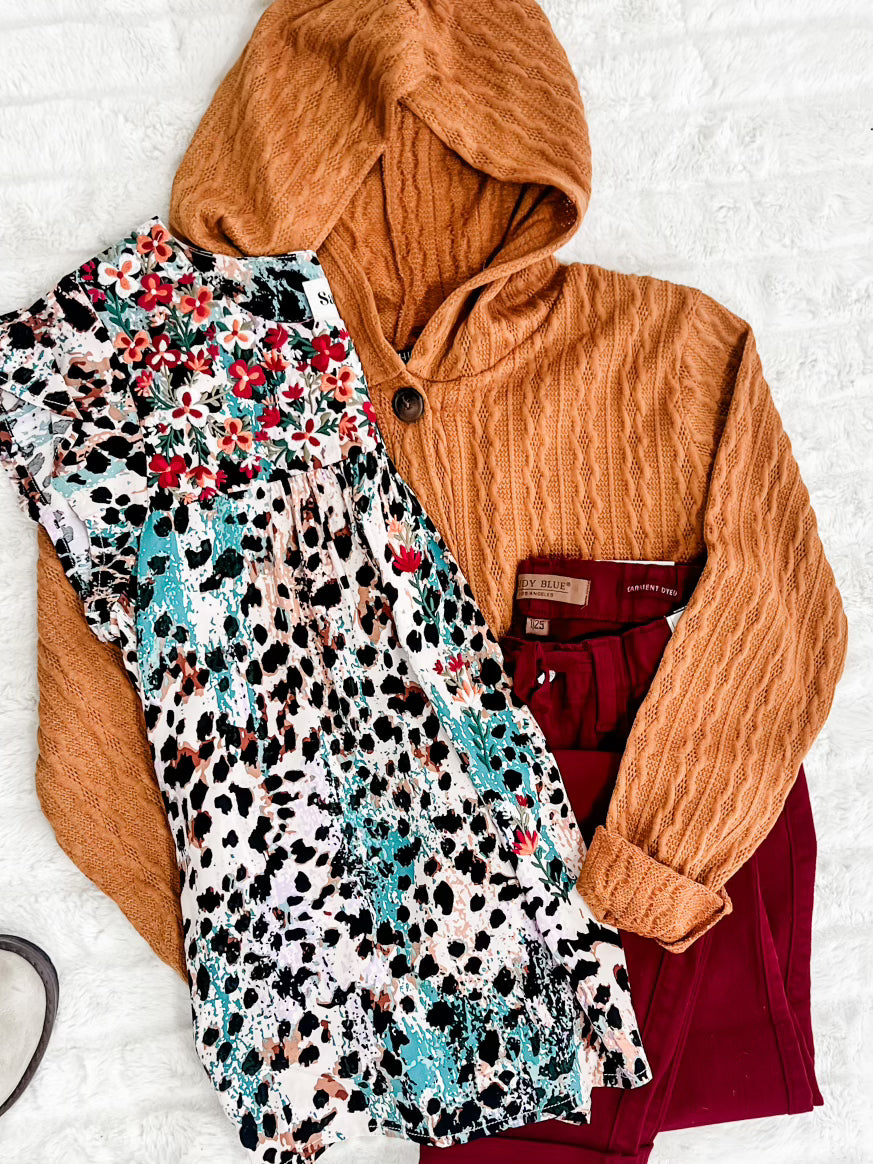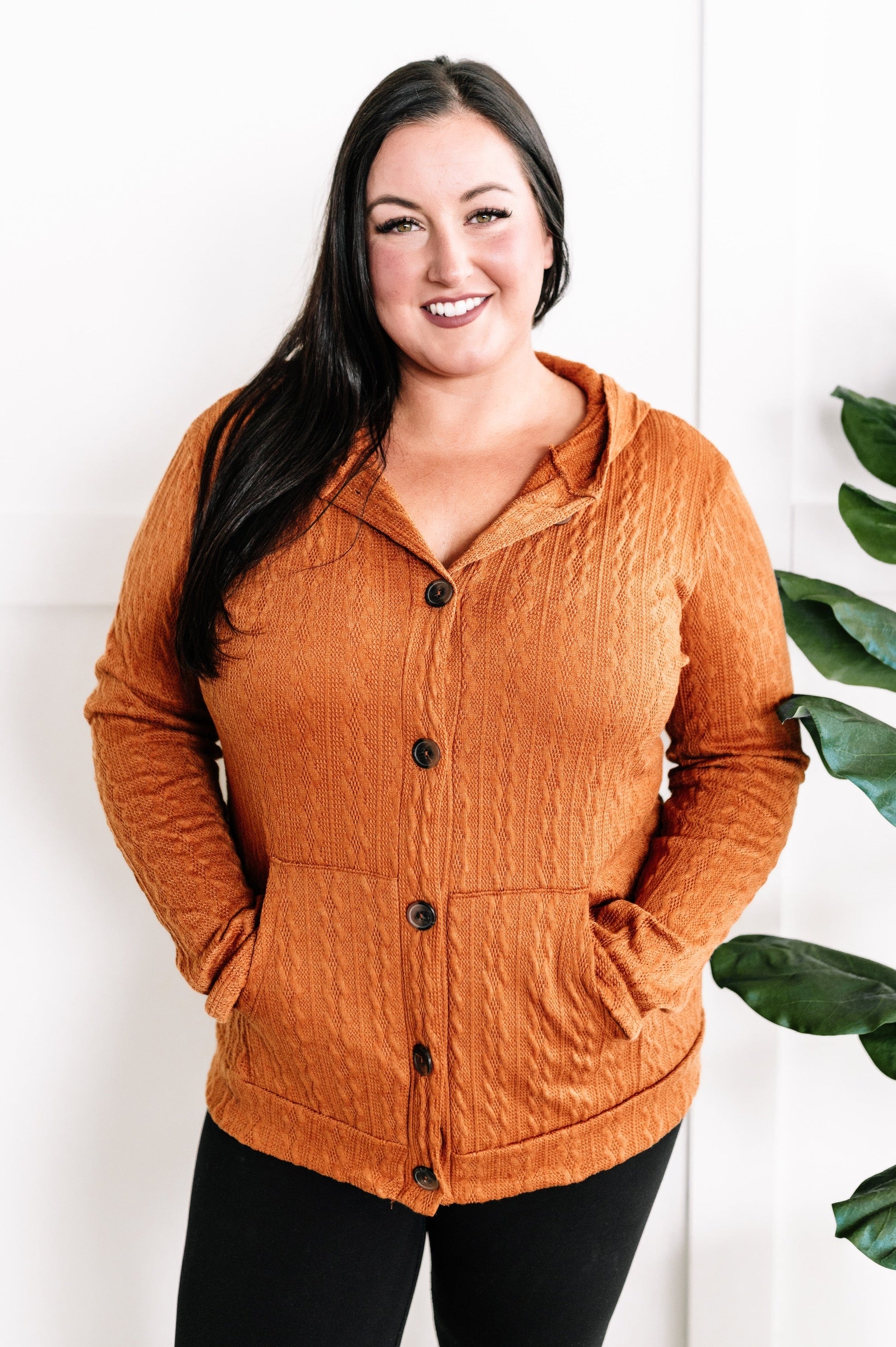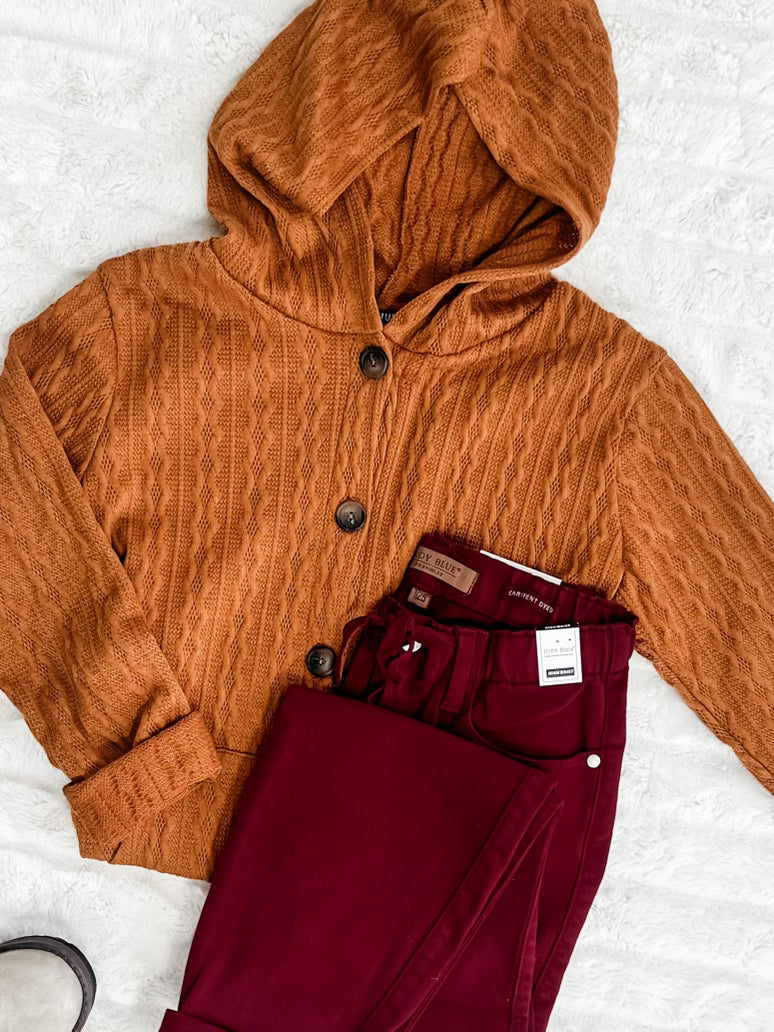 Cable Knit Hooded Cardigan In Burnt Orange