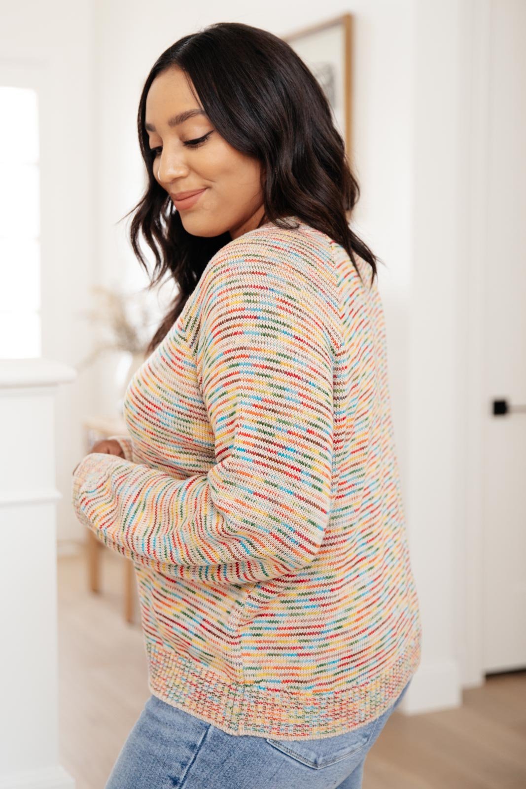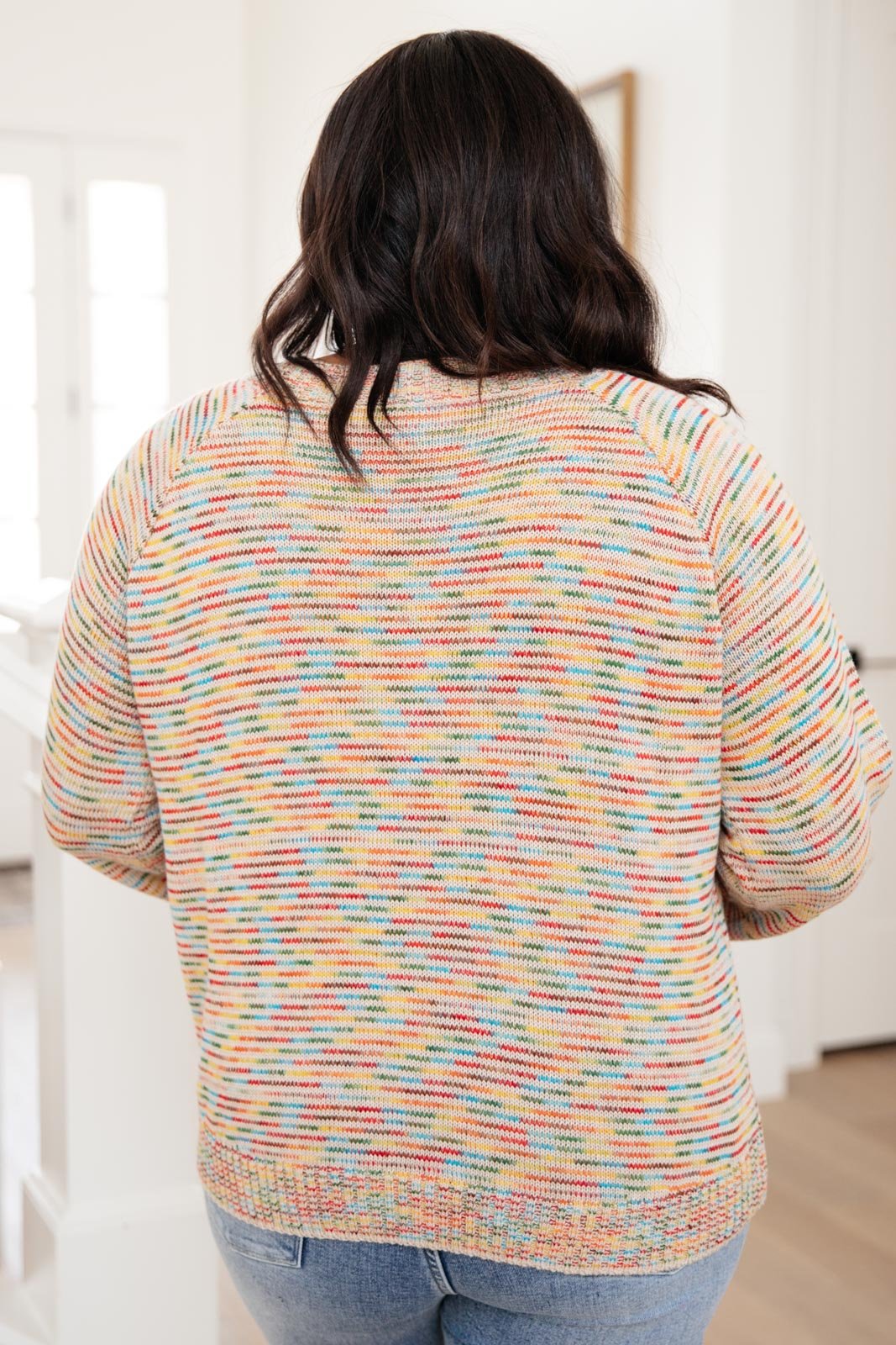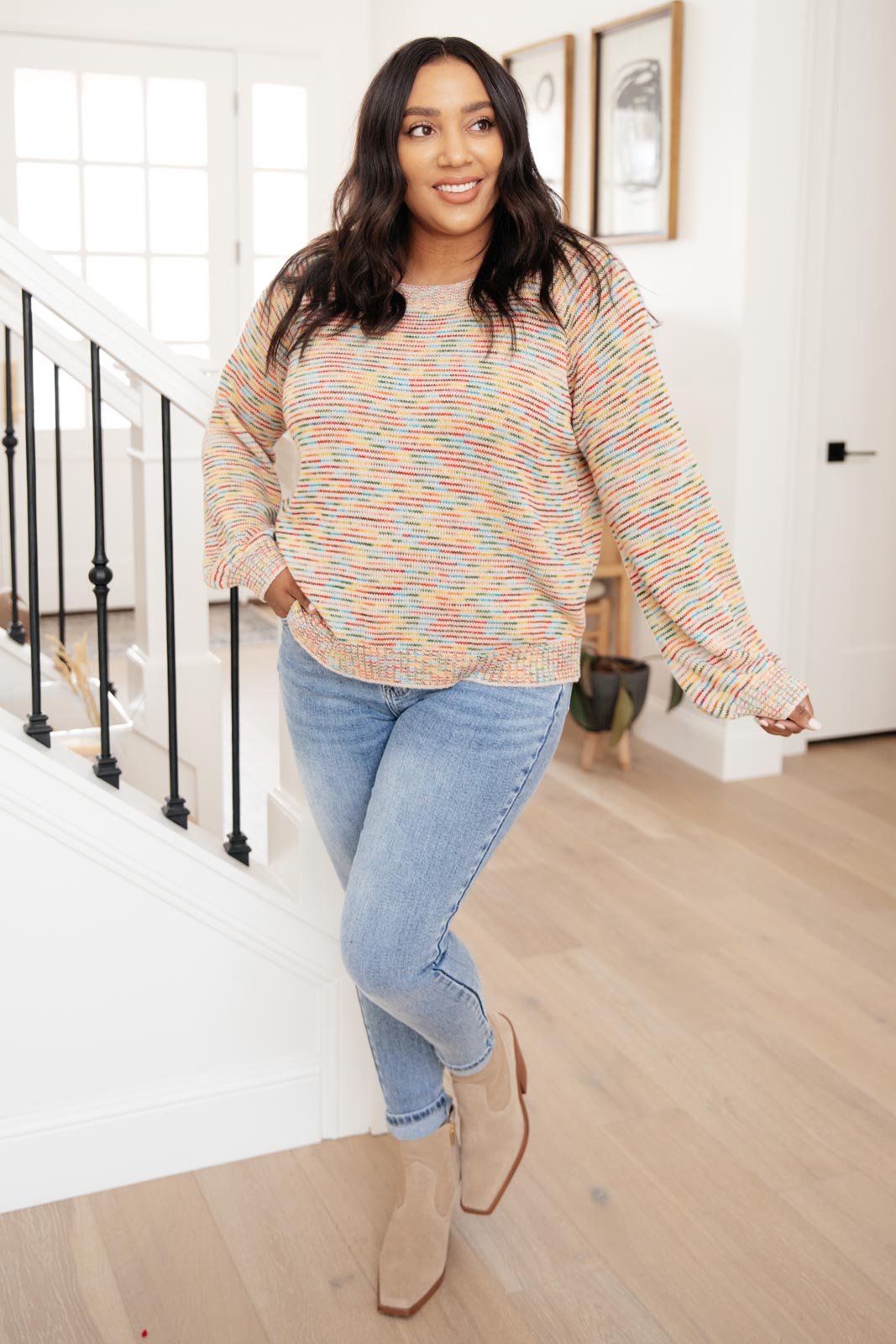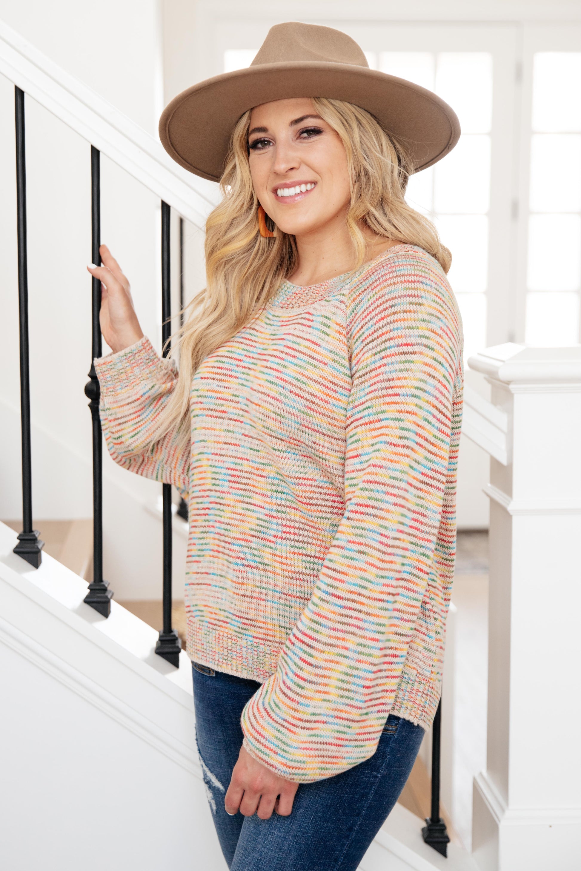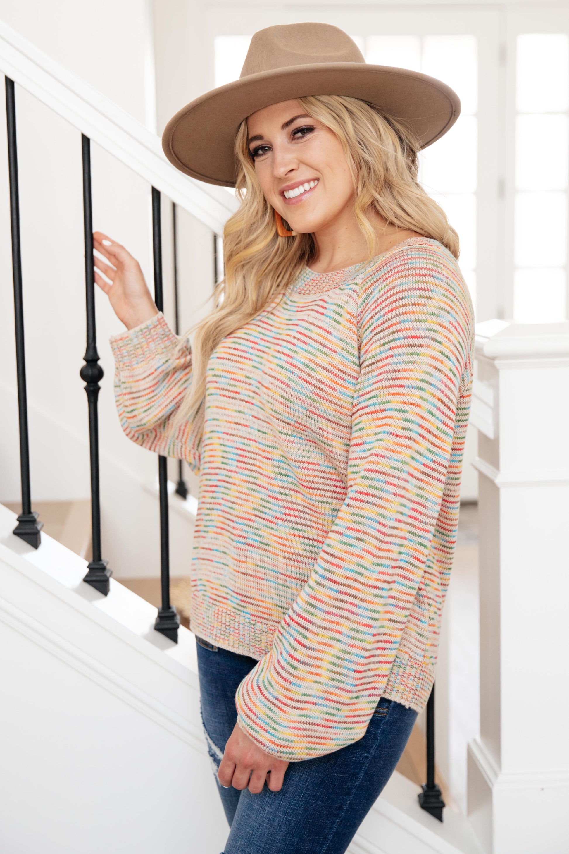 We can't get enough of the Cozy In Color Sweater! This sweater has a comfortable fit and adorable details in the matching wrist and neckline. We love the neutral base with mismatched stripes of color. Pair this sweater with jeans and boots.
