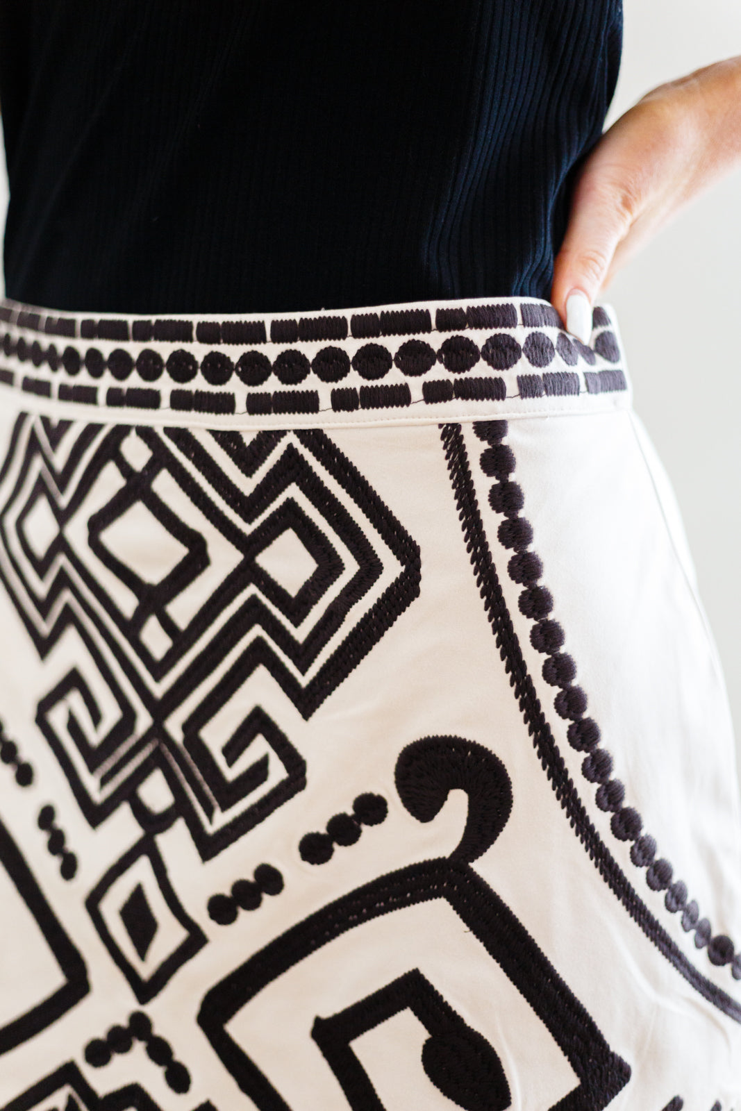 Be the center of attention in the Estrella Patterned Skirt! This stunning skirt features an ultra soft faux suede, embroidered in a geometric black design overlaying the front. Complete with a back zipper closure and inner lining for functionality and comfort!