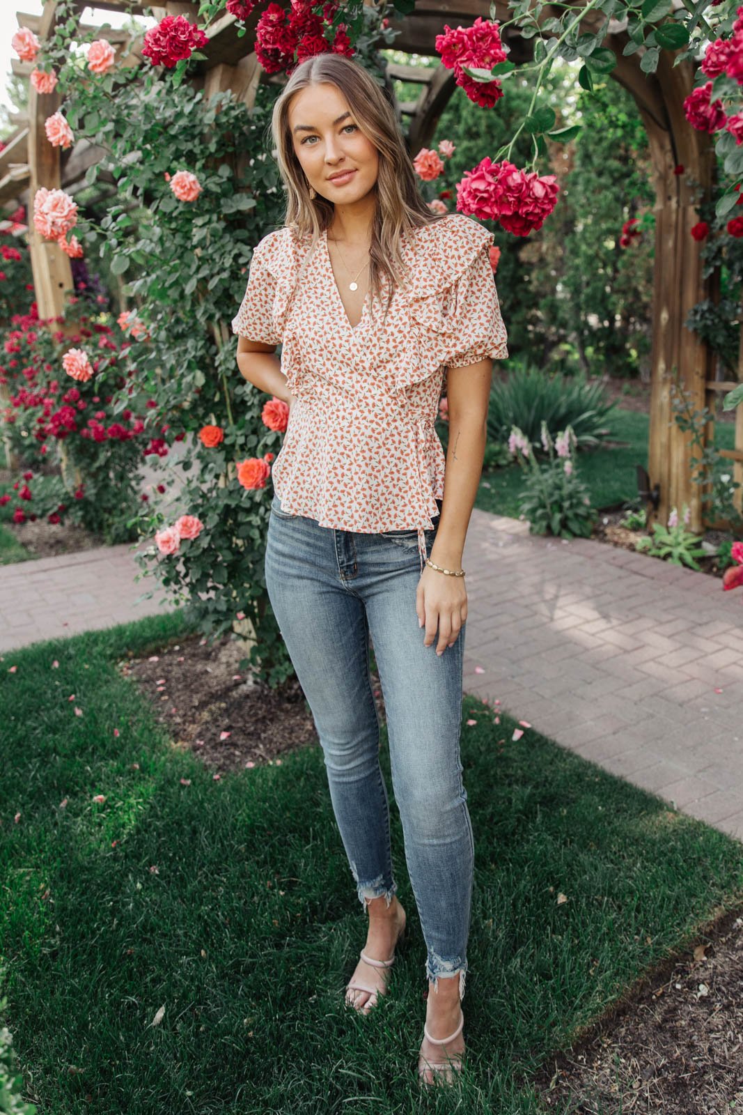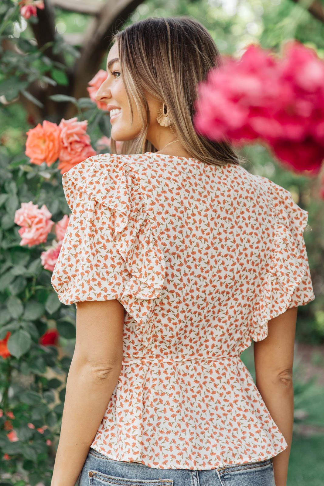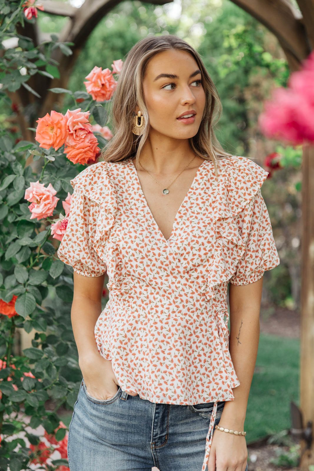 The Folksong Floral Top in Coral is a great way to bring a subtle floral print into your summer wardrobe. With tons of tiny flowers sprinkled all over this beautiful top and ruffled sleeves, you'll feel pretty and feminine every time you wear it. Pair this with trousers for a polished look, or your favorite slim fit jeans for a perfectly put together option.