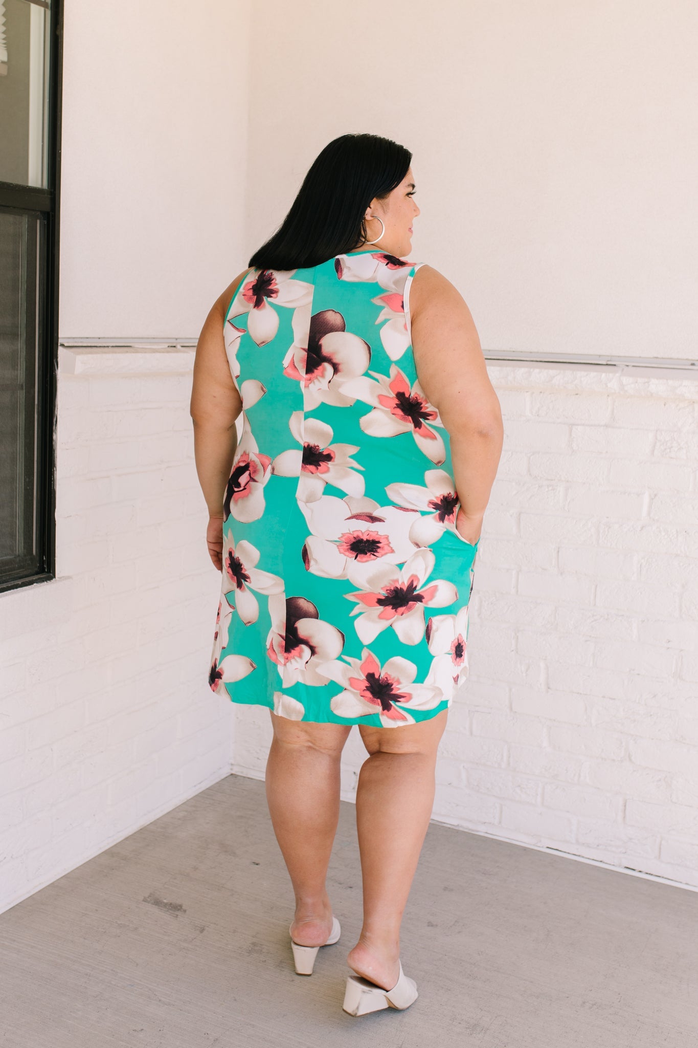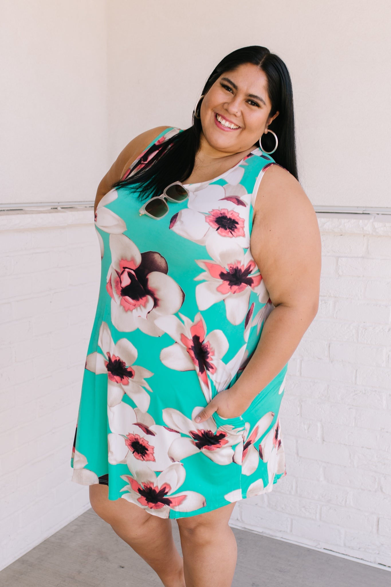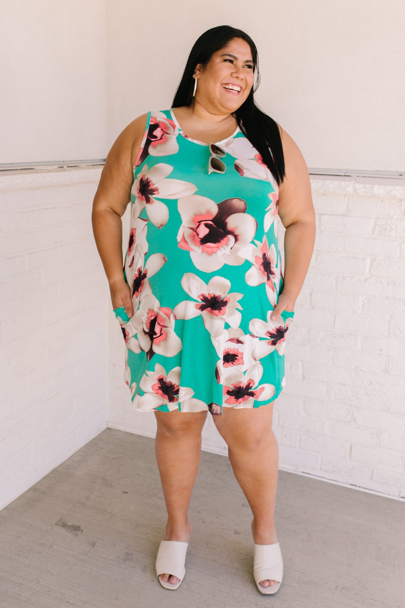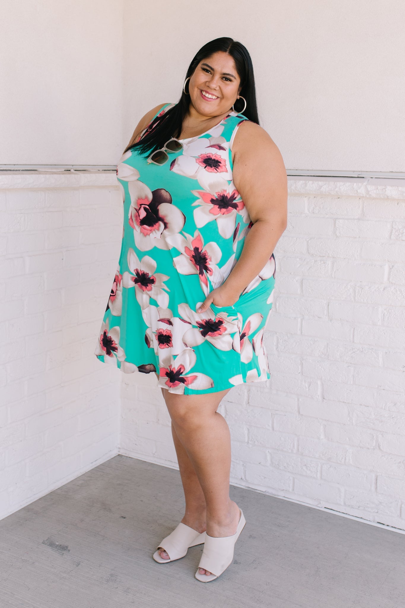 Brunch? Sister Date? Beach? Whatever it is the Fresh Feels Tropic Dress is the perfect match! A mint color, stretchy polyester shapes a sleeveless, a-line style dress, with side seam pockets, and a pink oversized flower print!
