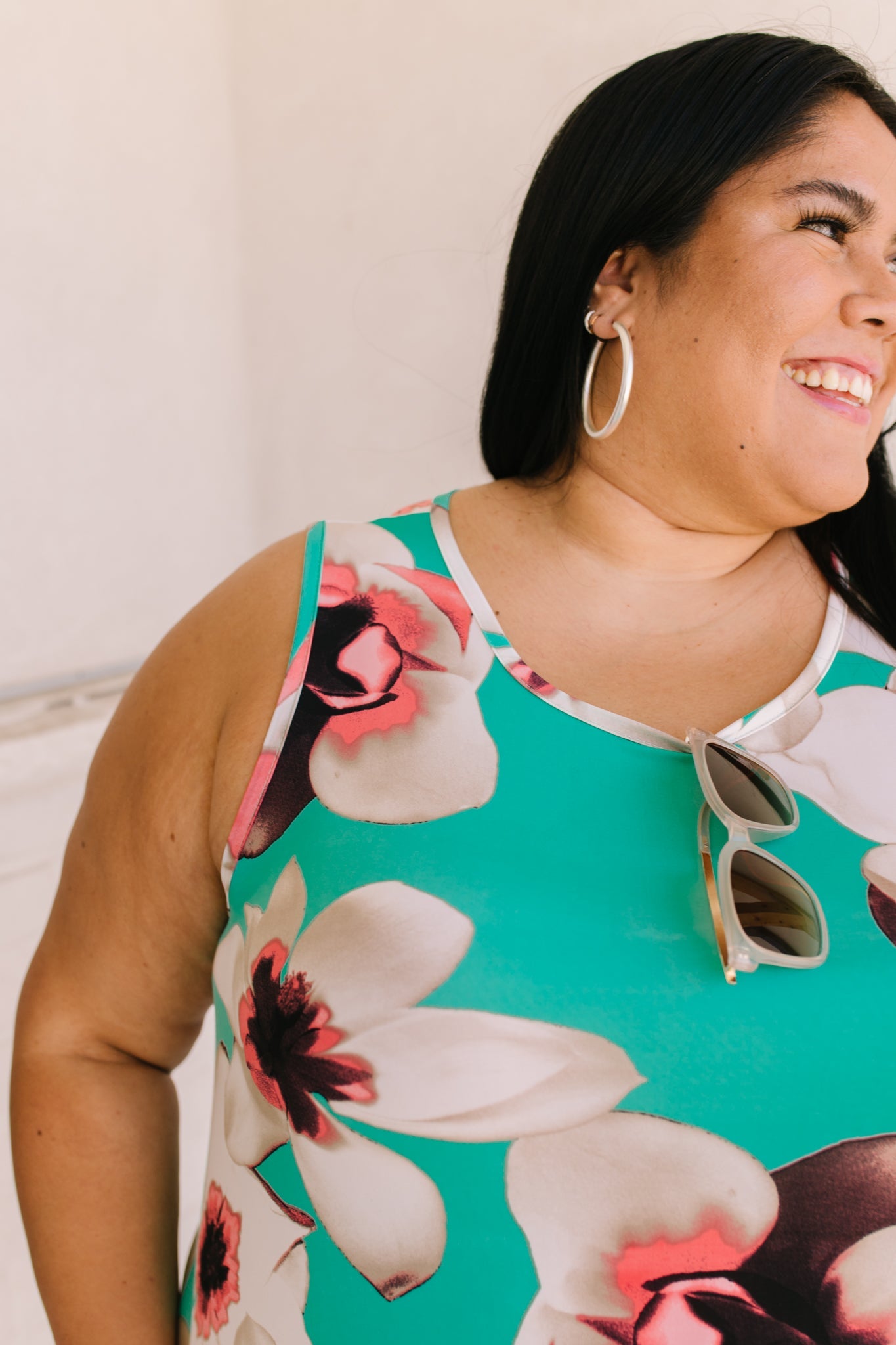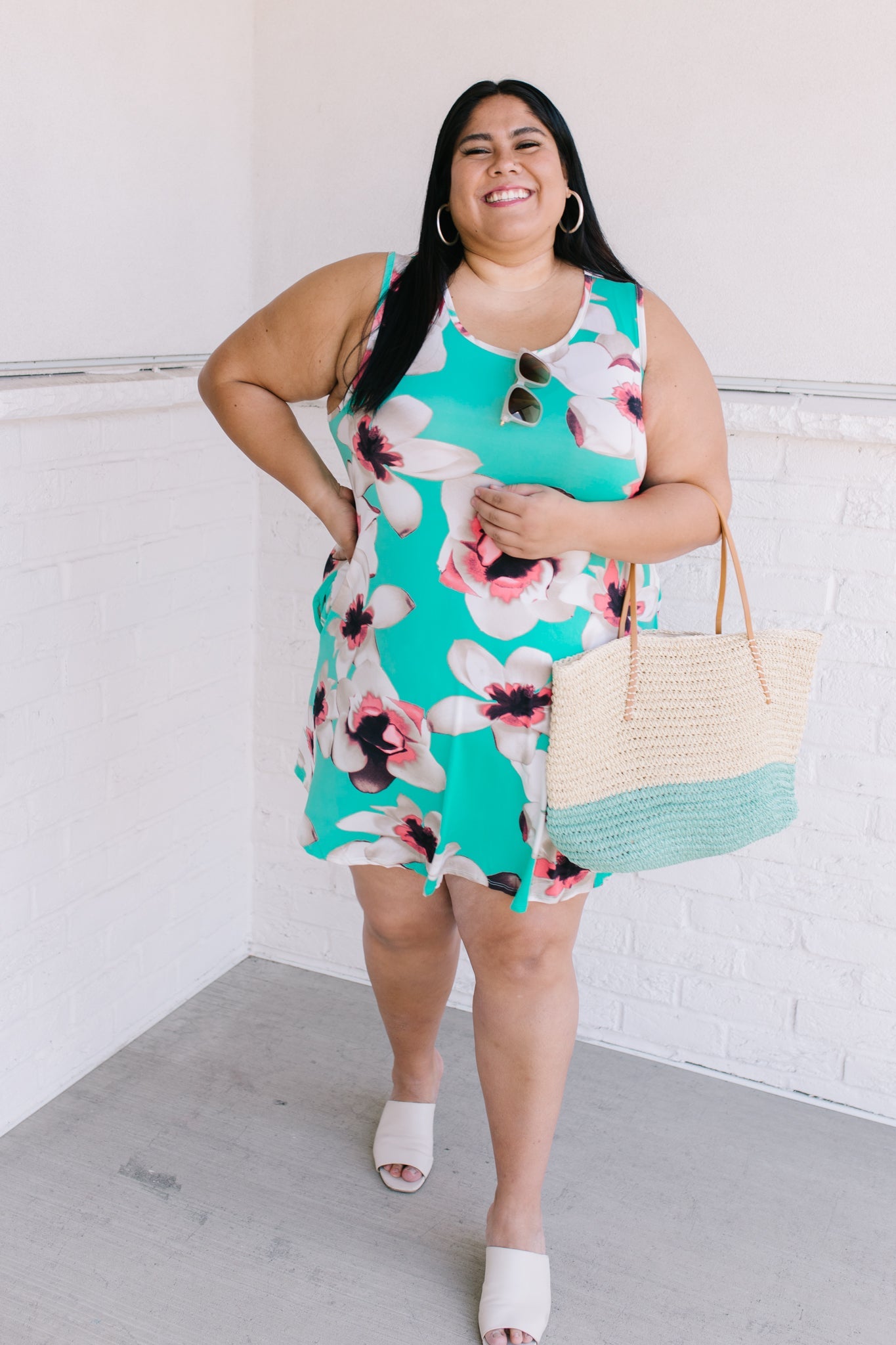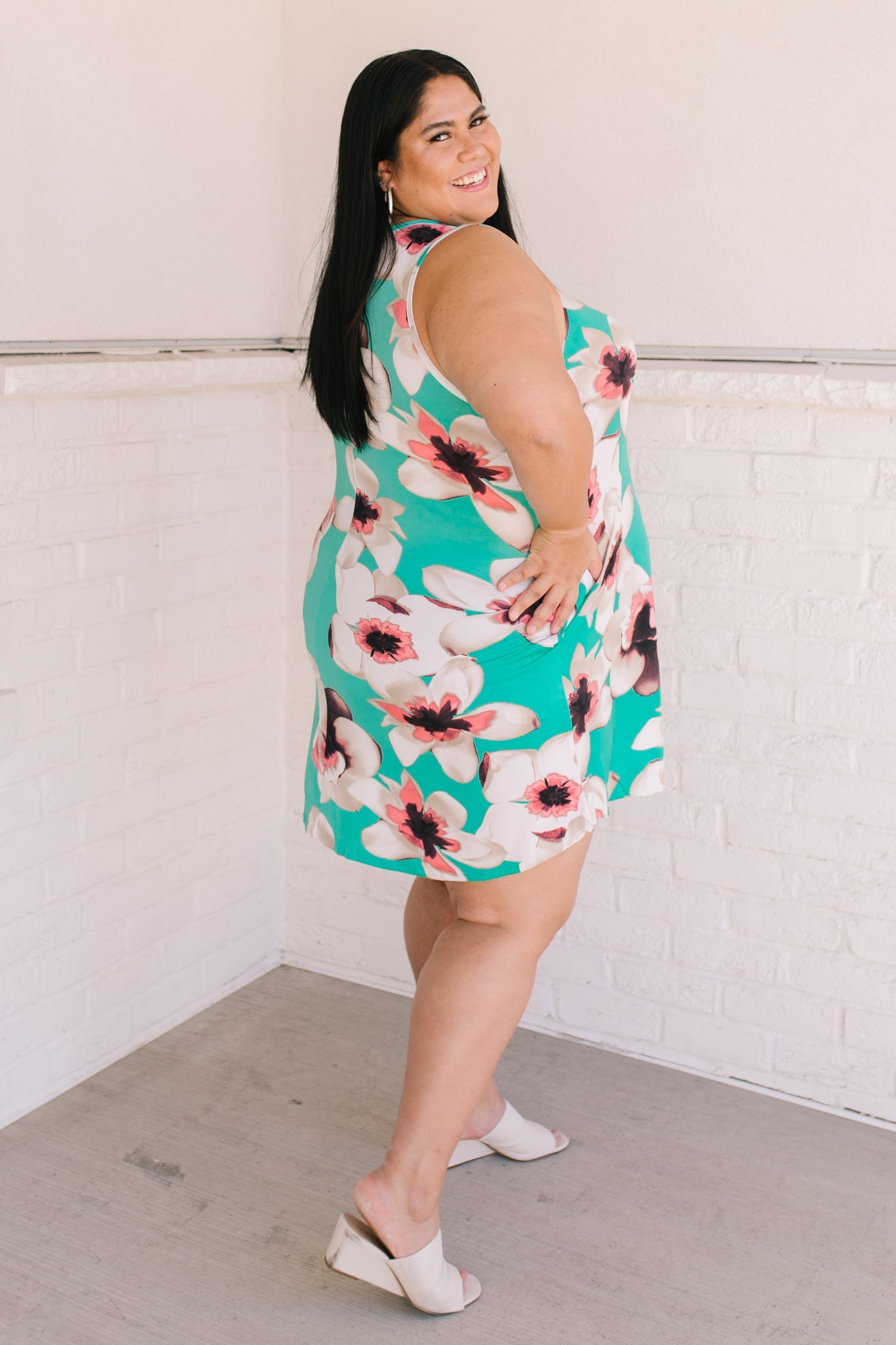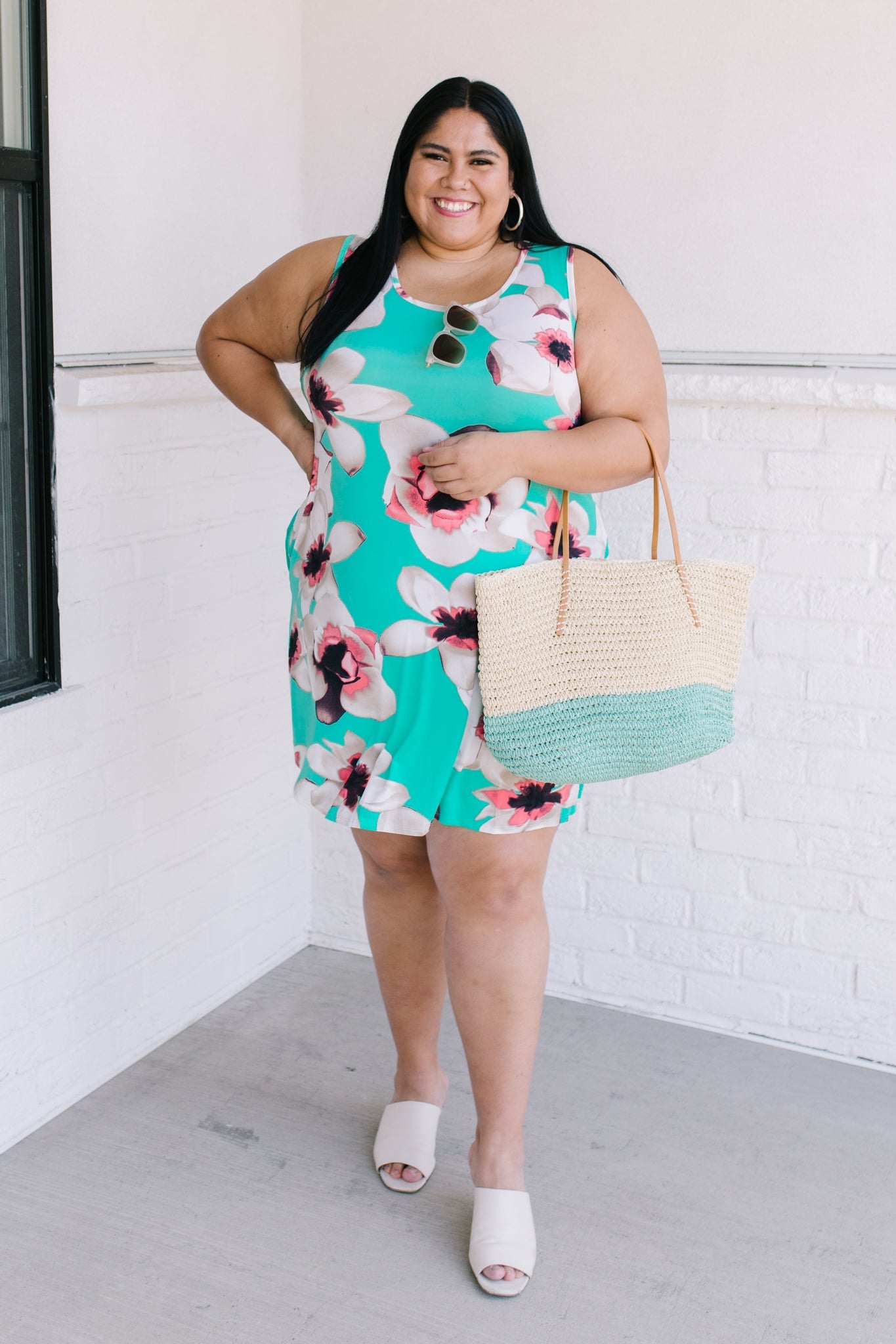 Brunch? Sister Date? Beach? Whatever it is the Fresh Feels Tropic Dress is the perfect match! A mint color, stretchy polyester shapes a sleeveless, a-line style dress, with side seam pockets, and a pink oversized flower print!