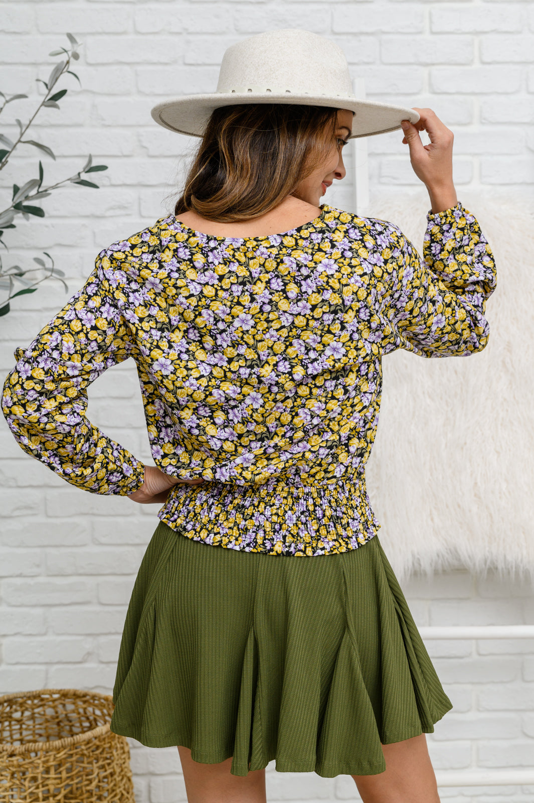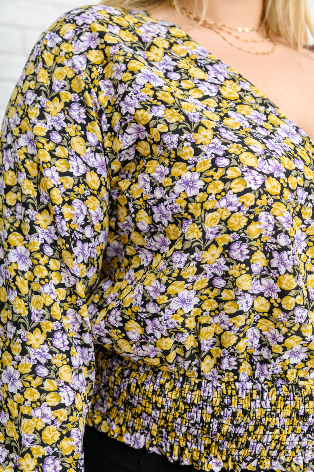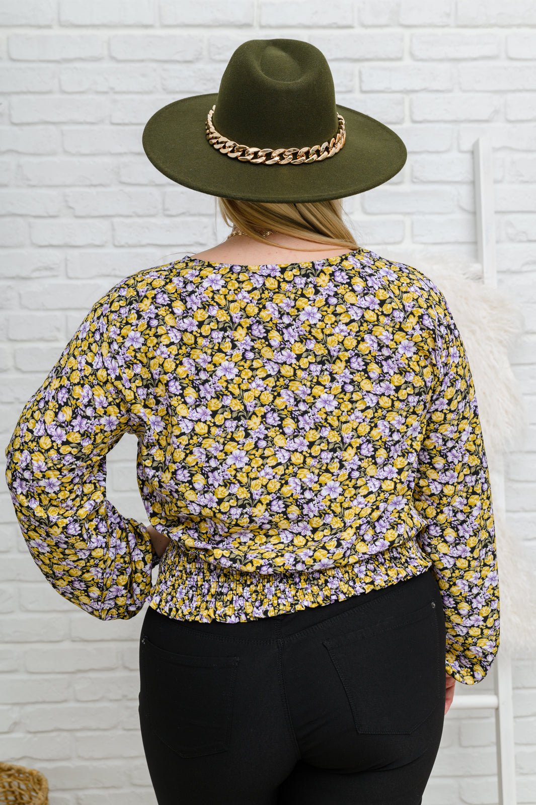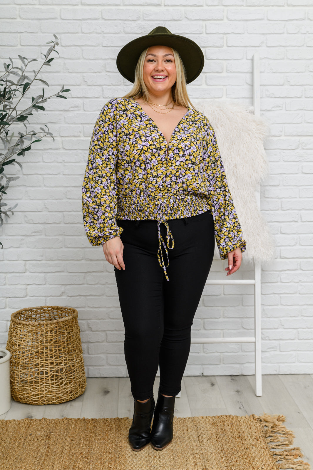 Its easy to look put together once you slip into the Honey Honey Floral Smocked Blouse In Black! This darling top features a floral print fabric that shapes a v-neckline formed by a triple hook & eye detail lining the center front. Long balloon sleeves end at elastic cuffs with a smocked waistband and tie detail.