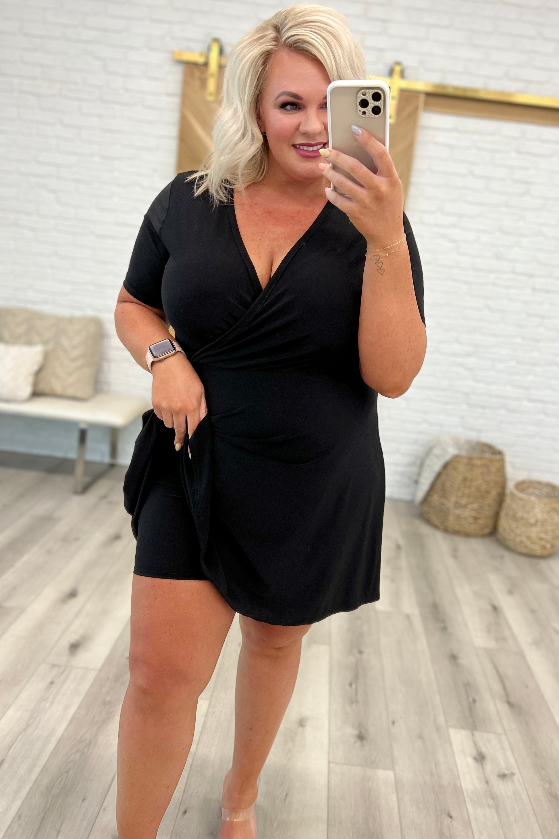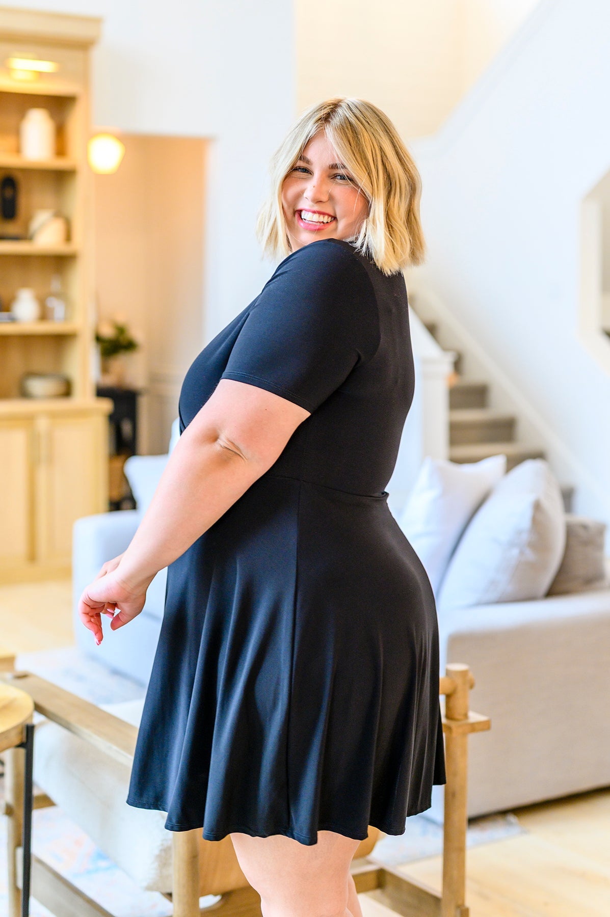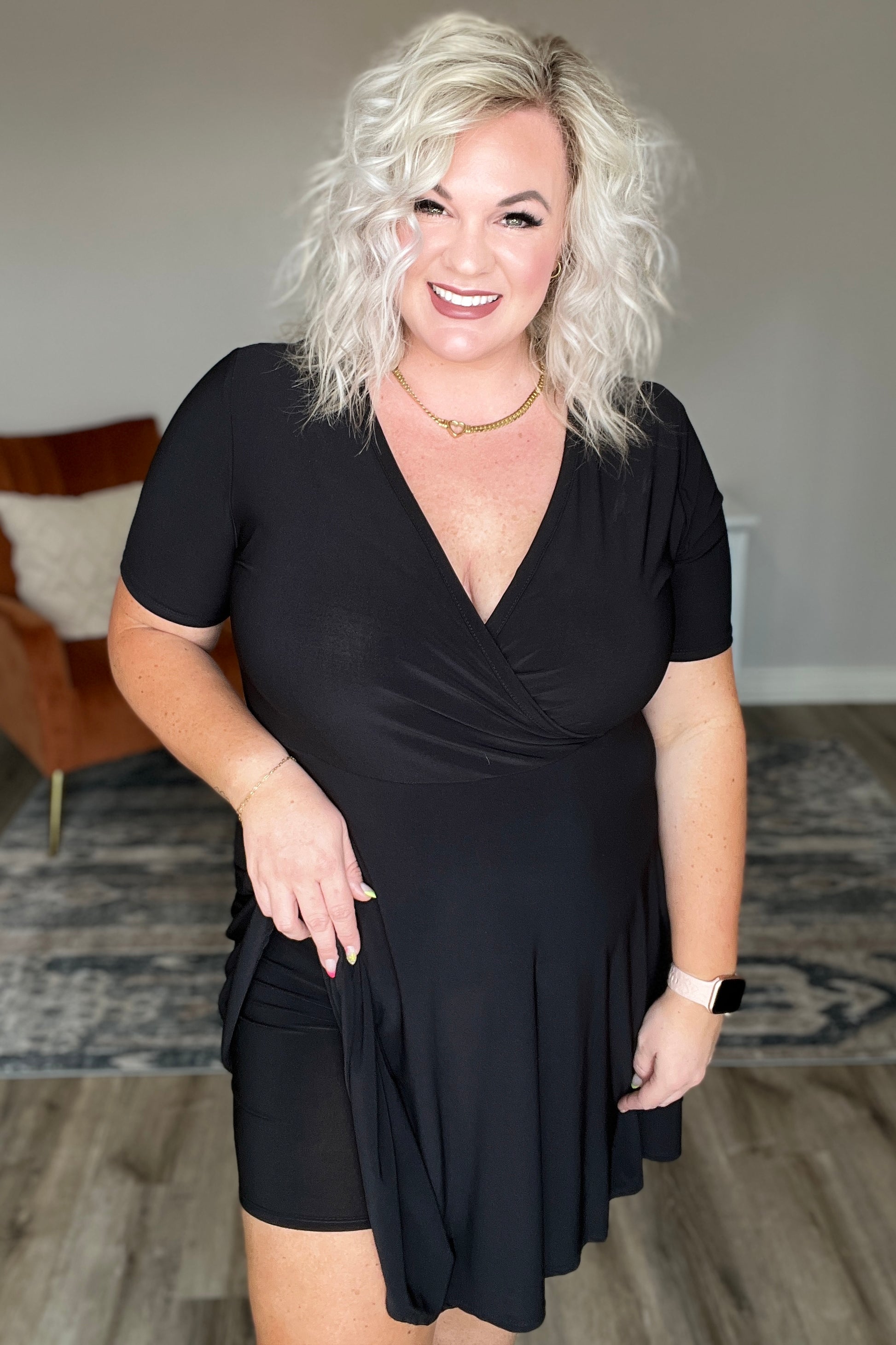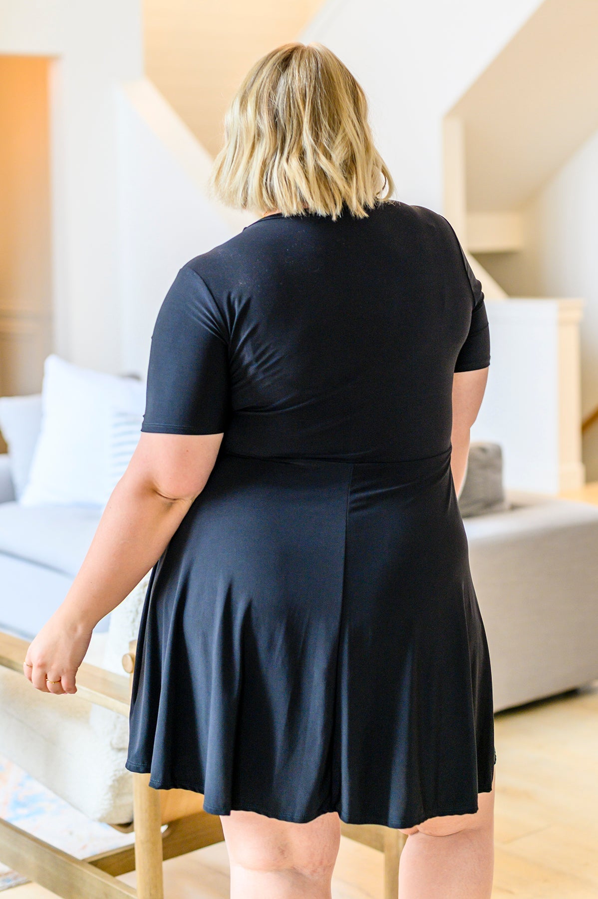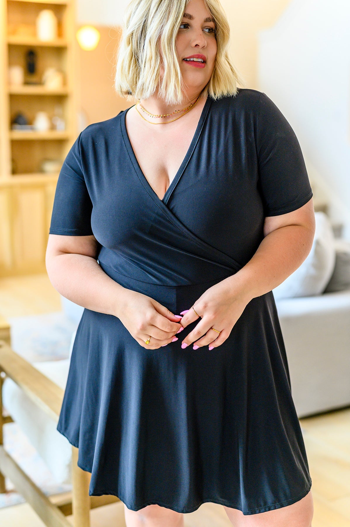 Look modern and beautiful in this Sincerely Yours Skort Dress. Its slinky knit fabric and surplice front look chic and timeless, while the v-neckline, short sleeves, and circle skirt flatter your figure. Plus, a built-in short layer ensures comfortable coverage.