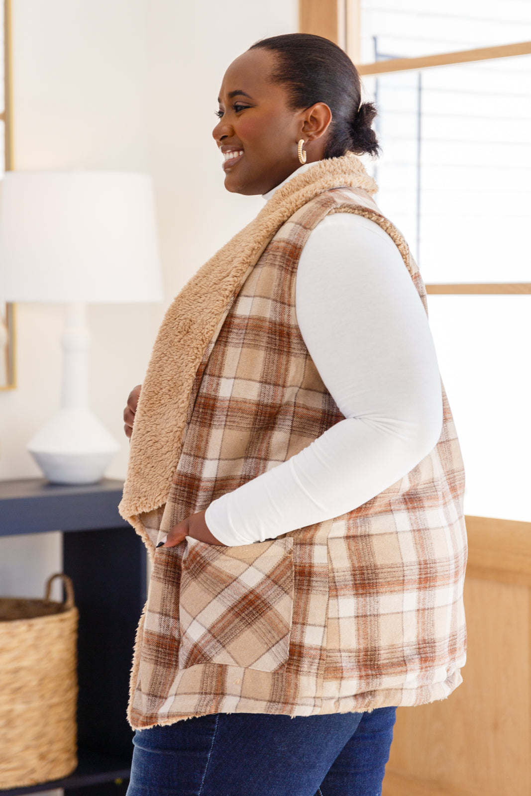 Snug And Stylish Plaid Fur Lined Wide Collar Vest