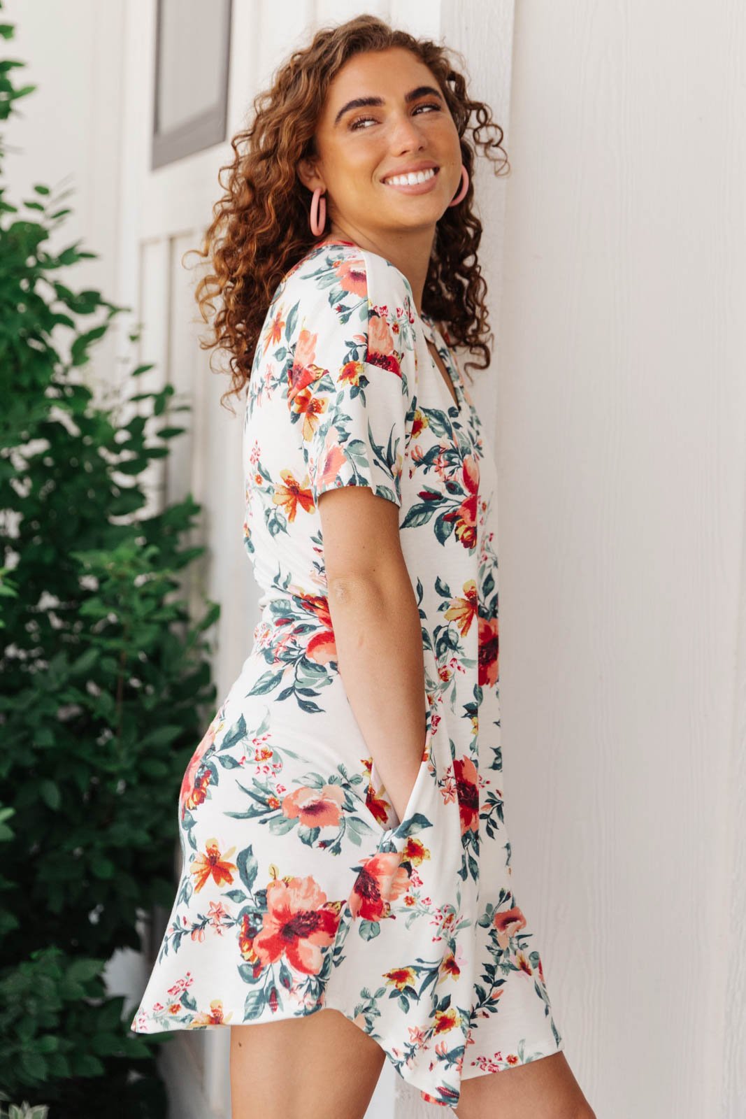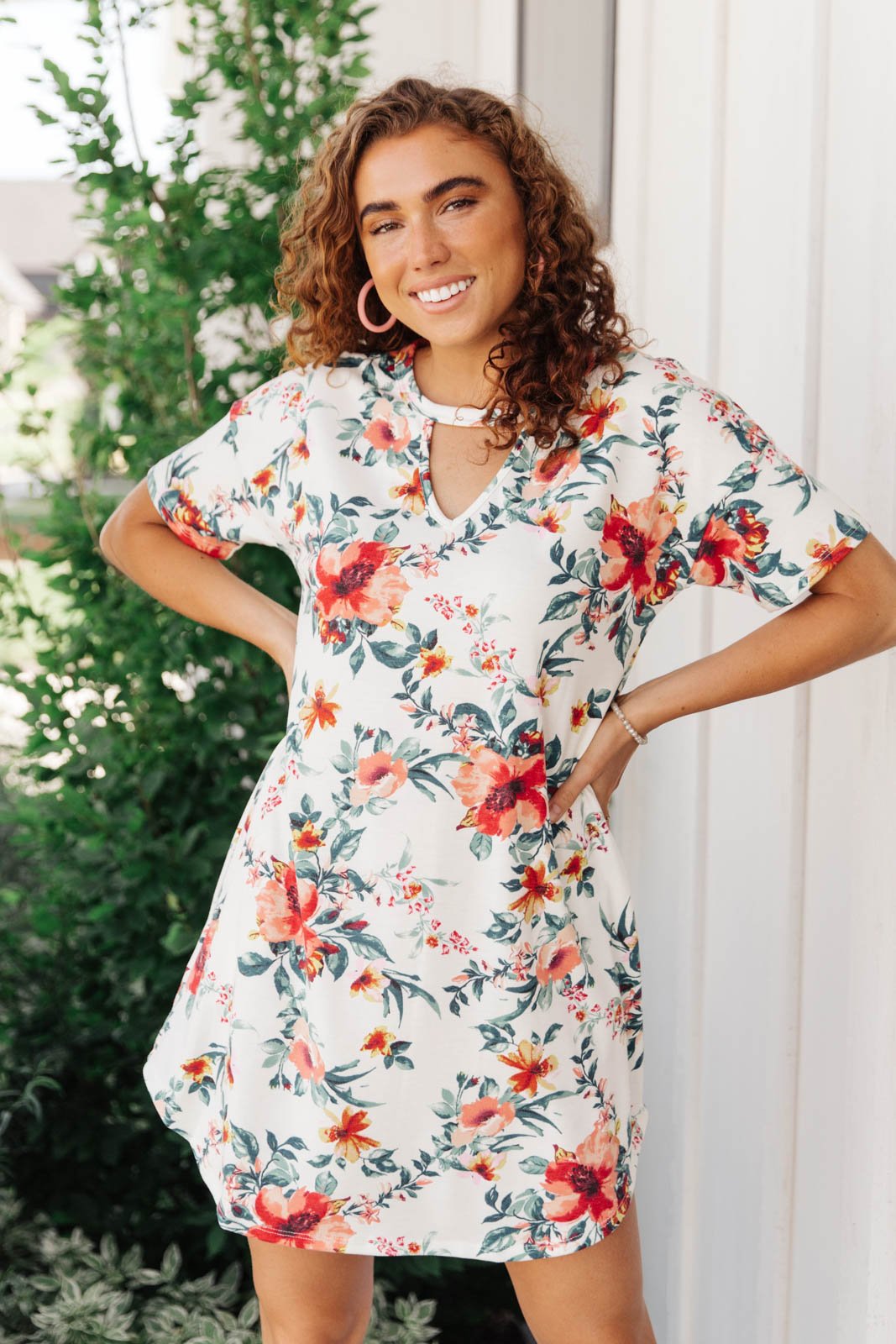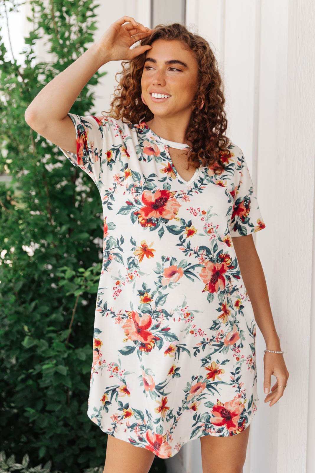 The Watercolor Blossoms Dress brings an artistic twist to a comfy t-shirt dress. This dress features beautiful blossoms and a cutout v neckline. Pair this dress with some cute flats or sneakers for a laid back look.