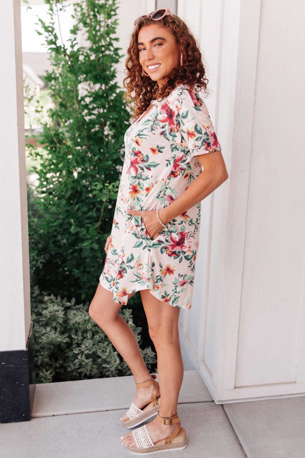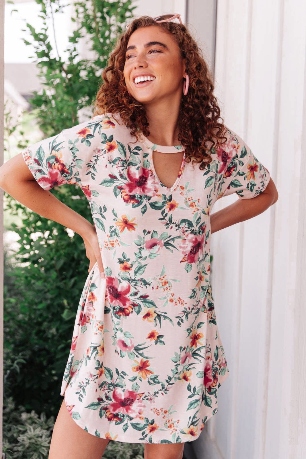 The Watercolor Blossoms Dress brings an artistic twist to a comfy t-shirt dress. This dress features beautiful blossoms and a cutout v neckline. Pair this dress with some cute flats or sneakers for a laid back look.