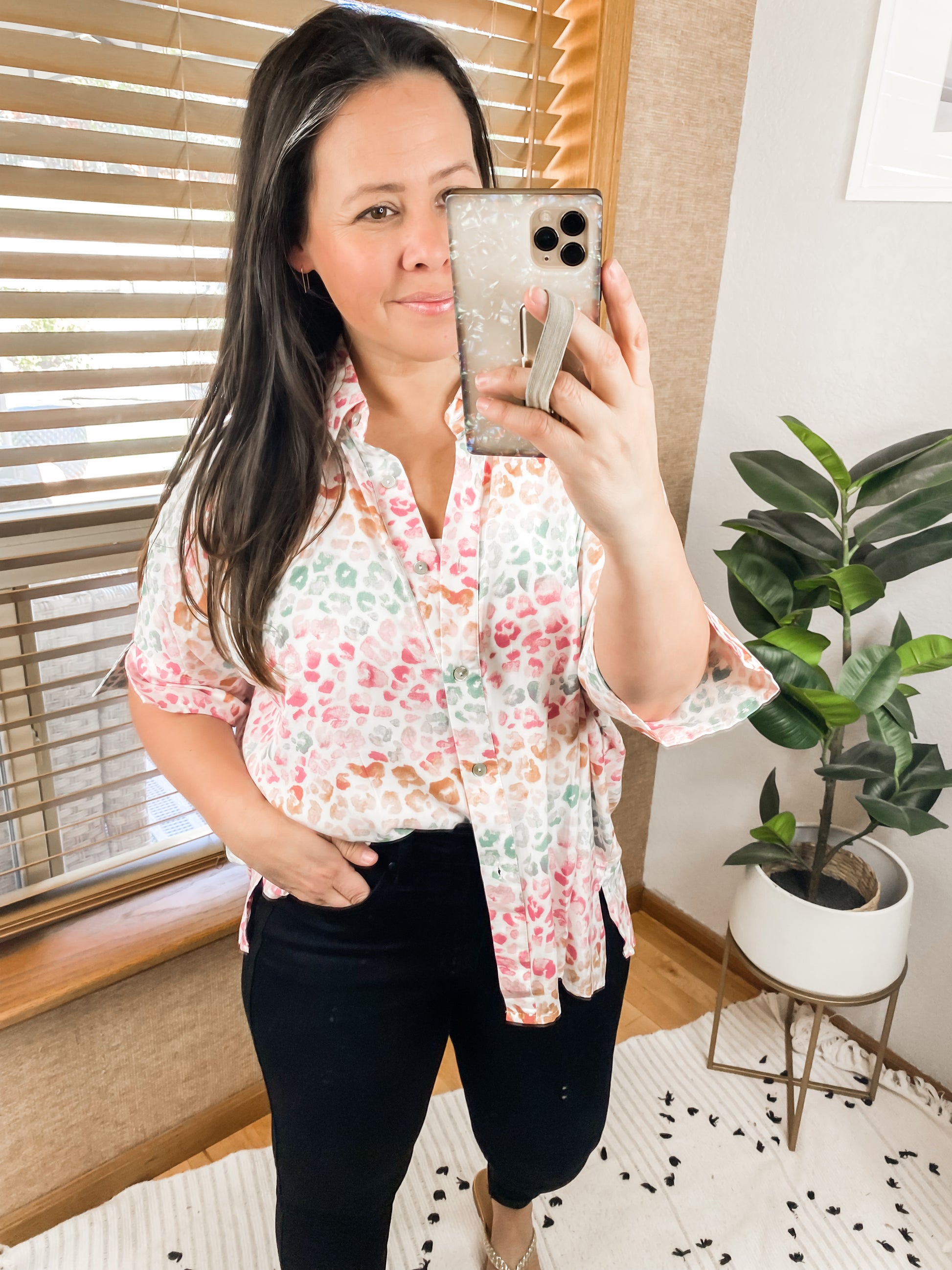 Treat yourself to a unique, eye-catching style with the vibrant Wild Rainbow Blouse! Featuring a stunning animal print in a rainbow ombre color scheme, this boxy fit blouse features a button front closure, collared neckline, and dolman sleeve with split cuffs. Spice up your wardrobe today!
